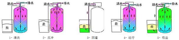 第4题:下图所示全自动钠离子交换器运行-再生示图,正确的顺序是( )。